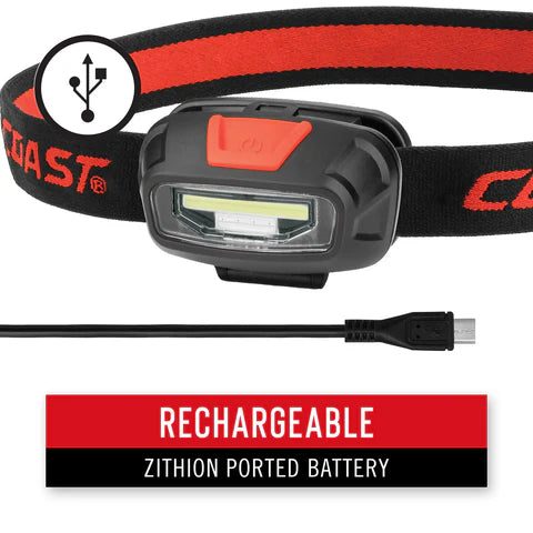 The FL13R brings rechargeable capabilities to a high-performing headlamp at an affordable price point. The compact C.O.B. LED headlamp features high- and low-light outputs, as well as solid and flashing red LED lights for safety/visibility and to prevent night blindness.