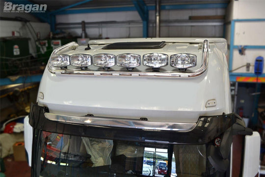 Please Note: Sale is for Roof Bar + Jumbo Spots x4 + Clear Lens / Amber LED Beacon x2 + Single Barrel Trumpet Air Horns x2. This bar will NOT fit if truck has OEM Air Horns fitted, see listing for Bar B - item BRA23211B71WB if your truck has original manufacturer supplied air horns.
