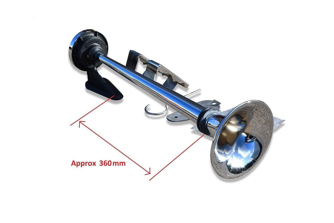 With 2x Single Barrel Trumpet Air Horns (non rusting) made from chrome plated brass for mounting to truck light bars. Can also be mounted directly to a flat surface. This air horn is of high quality and manufactured in Italy, not to be confused with cheaper Chinese products. Comes complete with fixing hardware, excluding control valves.