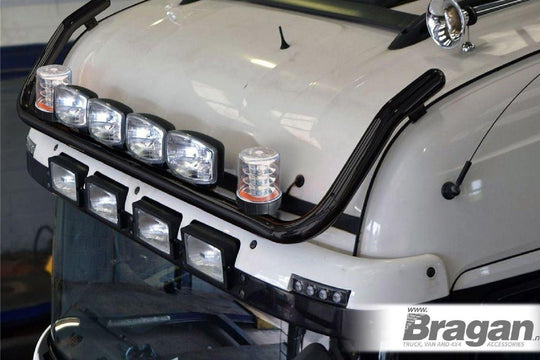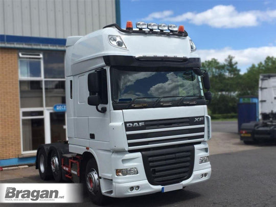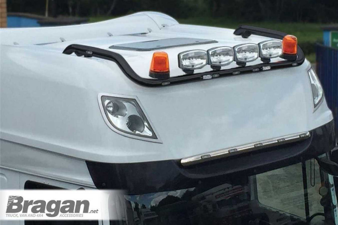 High quality Black Powder Coated Stainless Steel Spot Light Roof Bar with Flush LEDs x7, Jumbo Oval Spots x4 and Clear Lens Beacons x2 to suit DAF XF 106 2013+ Super Space Cab. These bars now have curved side ends.