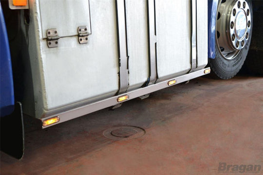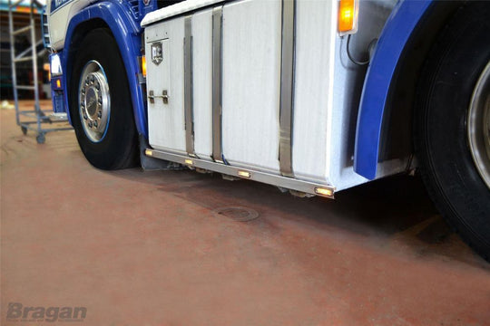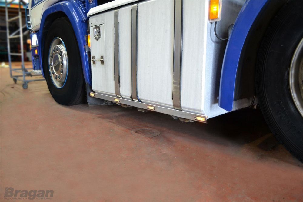 High quality Stainless Steel 6x2 / 6x4 LED Side Bar Trims to suit DAF XF106 2013+. These trims greatly enhance the look and style of your vehicle as well as providing greater visibility on the road.