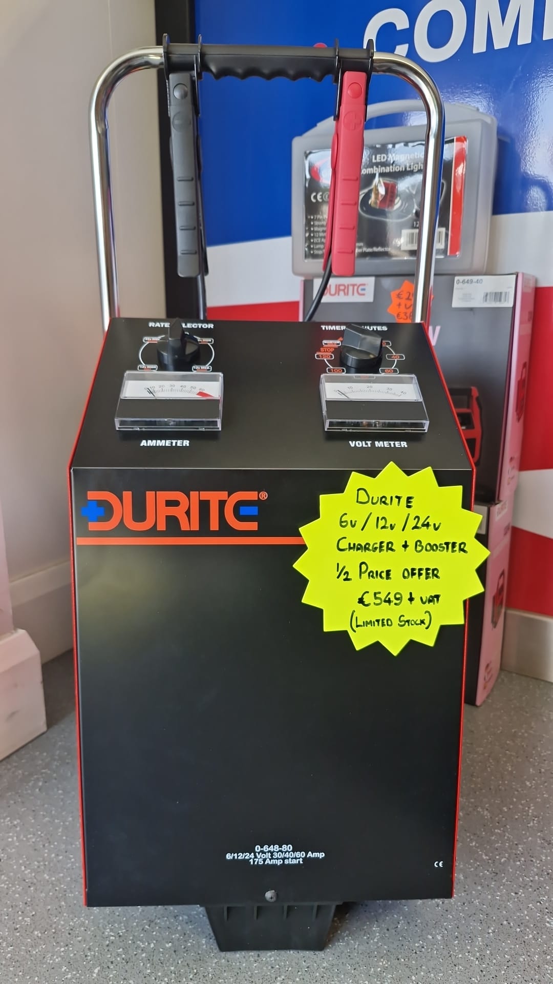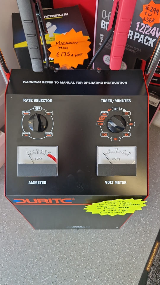 6/12/24 volt, 60 amp trolley heavy-duty booster/charger with charge timer for professional use. ‘Hi’, ‘Medium’ and ‘Low’ charge rate options with 175 amp ‘Start Assist’, voltmeter, ammeter and thermal auto-reset overload protection. Powder coated steel case, rubber wheels and chromium plated handle. Supplied with crocodile clip and leads.