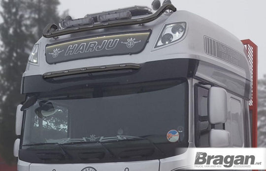 High quality Black Powder Coated Stainless Steel Visor Bar + White LEDs x5 to suit DAF XF 106 (2013+ models) SuperSpace Cab. This top of the range visor bar will have your vehicle looking top spec at a fraction of the cost of the genuine items but with the same high quality.